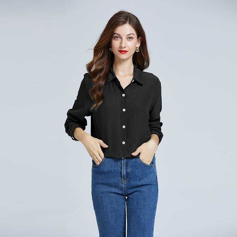 What are the wardrobe pieces that you will grab on your rush morning? The basics. This silk shirt is designed for your basic needs, featuring an understated raised placket and sharp shirt collar. Plus, you will be amazed by the baby's soft and smooth silk fabric.