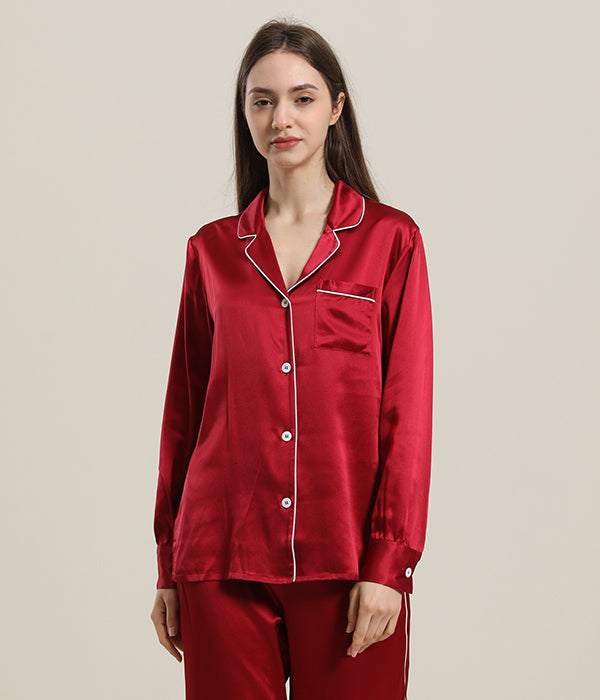 Experience the ultimate indulgence with these luxurious two-piece silk pajamas. Crafted from the finest 22 momme Mulberry silk, they drape beautifully on the skin with a glossy, smooth, and soft texture. The set features a self-tie waist for an adjustable fit, a left chest pocket with contrasting piping, and mother-of-pearl buttons. Elevate your loungewear game and enjoy a peaceful slumber in style.