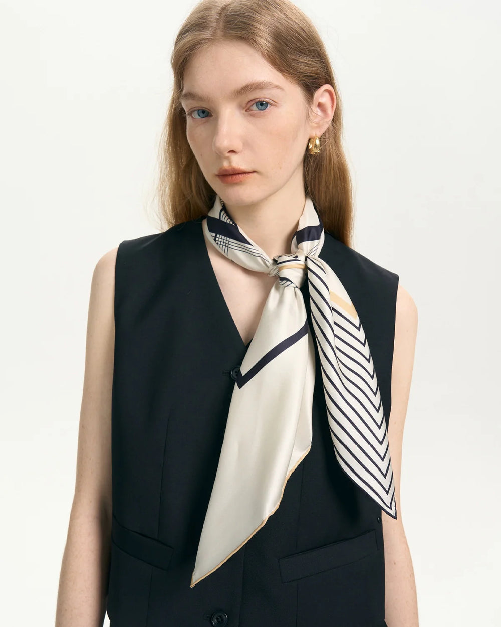 Featuring an asymmetrical black, white, and khaki stripe print, this scarf adds a modern and sophisticated touch to any outfit. Perfect as a neck scarf, head wrap, or bag accessory, its lightweight and soft fabric ensures comfort and versatility. A timeless piece for casual outings or special occasions, this scarf is a must-have for your wardrobe.
