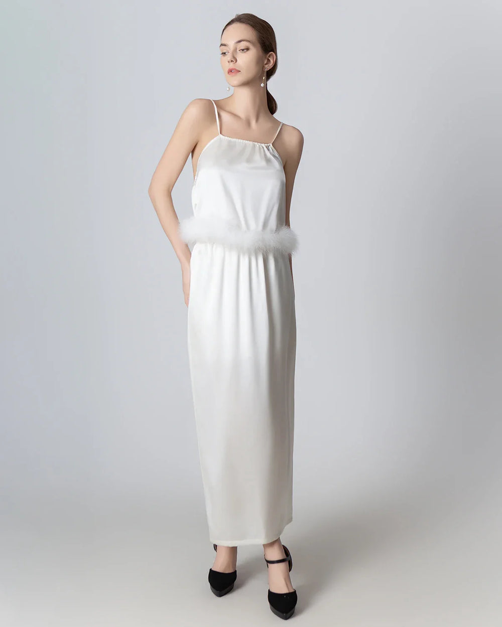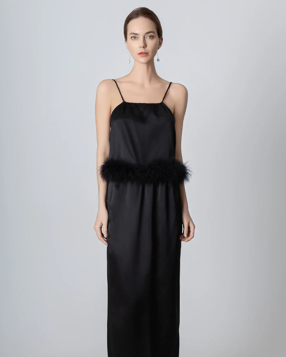 Introducing our stunning Backless Silk Camisole and Silk Maxi Skirt Set, adorned with exquisite ostrich feather detailing for a touch of luxury and allure. Crafted from sumptuous silk fabric, this set embodies sophistication and glamour, perfect for making a statement at any special occasion.