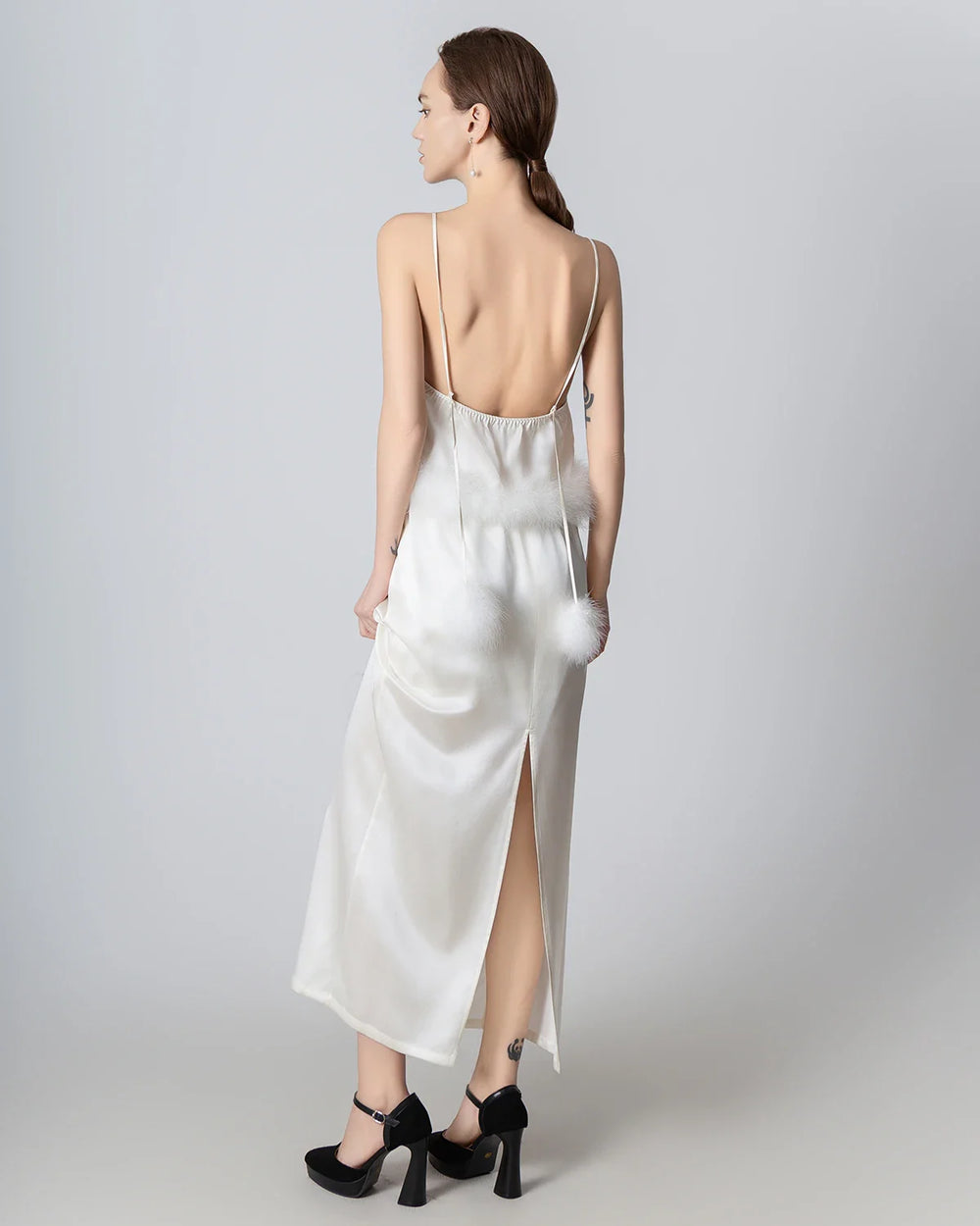 The backless silk camisole features a daring yet elegant design, while the ostrich feather trim adds a whimsical and glamorous touch to the hemline. Paired with the silk maxi skirt, which boasts a dramatic high slit at the back, this set exudes confidence and sophistication.