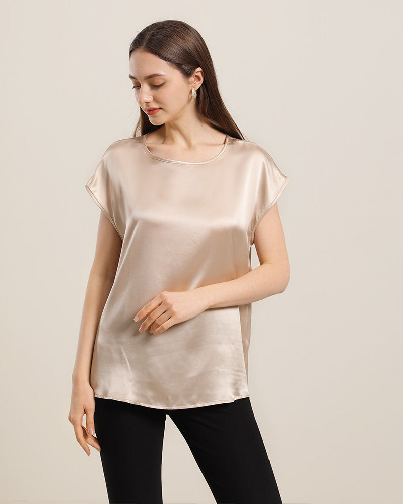 Details: This 19Momme silk short-sleeve blouse is perfect for hot summers. The fabric is lightweight and comfortable, and the classic round neck and short sleeve design is timeless and elegant. It allows you to stay cool and refreshed throughout the hot summer season.
