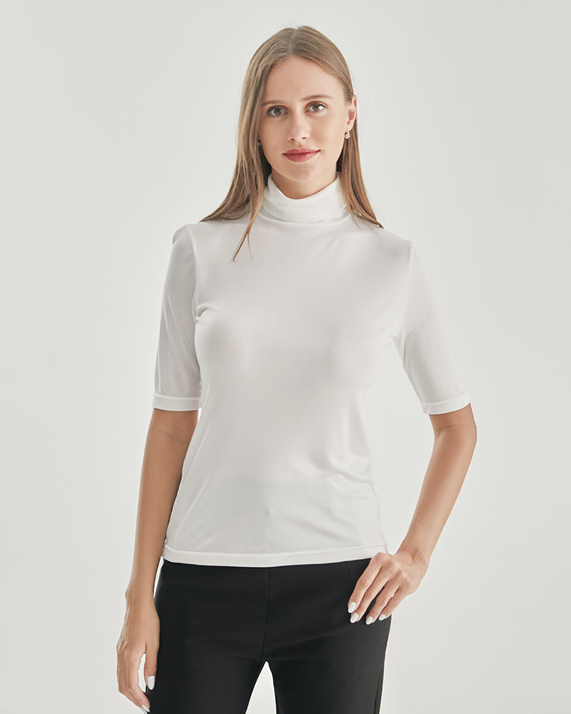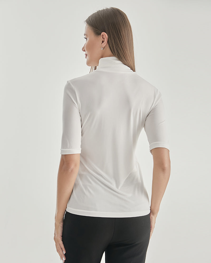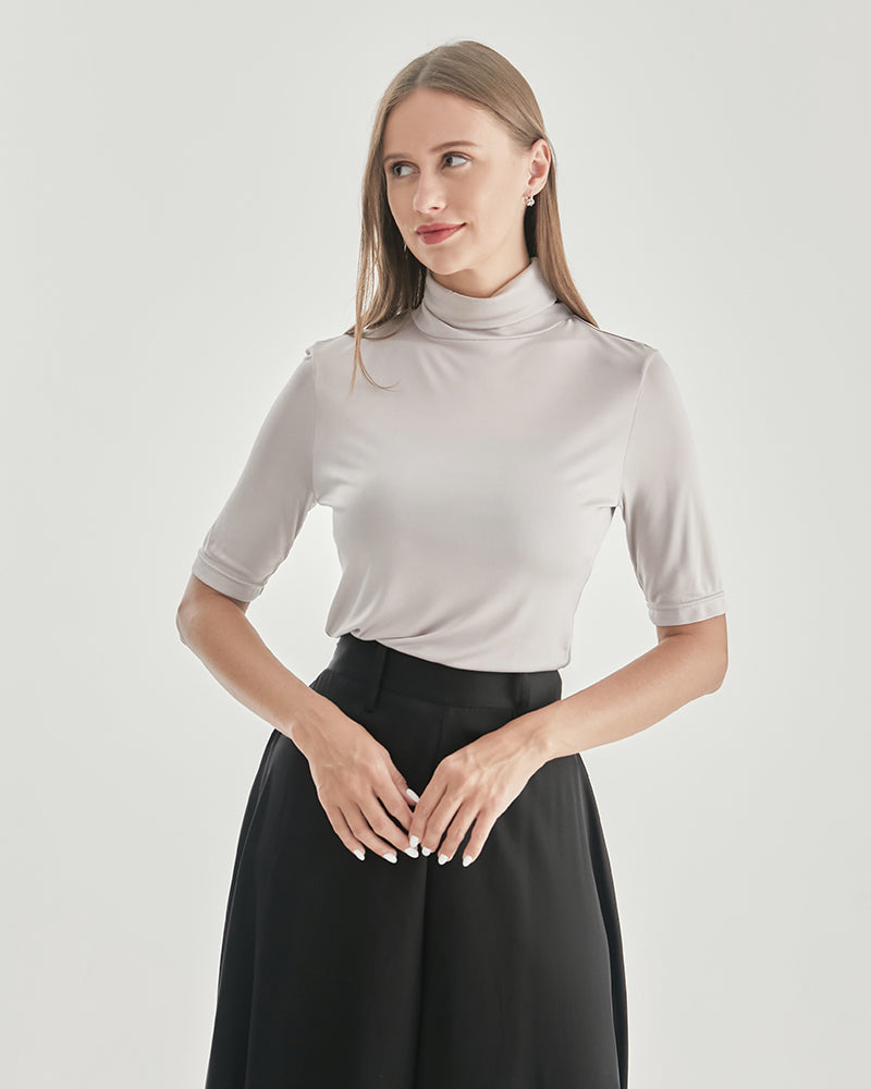 The snug fit of this turtleneck T-shirt accentuates your curves, highlighting your feminine silhouette in the most flattering way. The intricate knit pattern adds a touch of texture and depth, making this garment a standout piece in your collection.