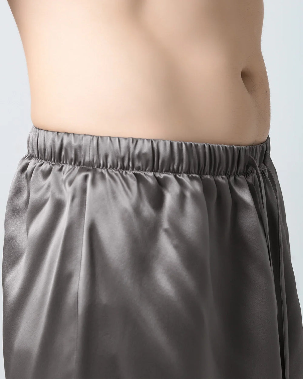 Introducing our men's silk sleepwear set, a perfect blend of comfort and style designed for warmer nights. Crafted from pure silk, this ensemble ensures a serene and restful night's sleep with its short-sleeved shirt and loose-fitting shorts. The clean and solid color palette exudes simplicity and elegance, while the lightweight silk fabric provides breathability and a luxurious touch against your skin. Embrace relaxation in style as the loose-fitting design allows for unrestricted movement, ensuring a cool and comfortable experience. Elevate your sleepwear collection with the understated charm and unparalleled comfort of our pure silk short-sleeved shirt and shorts set, where simplicity meets sophistication for a tranquil night's rest.