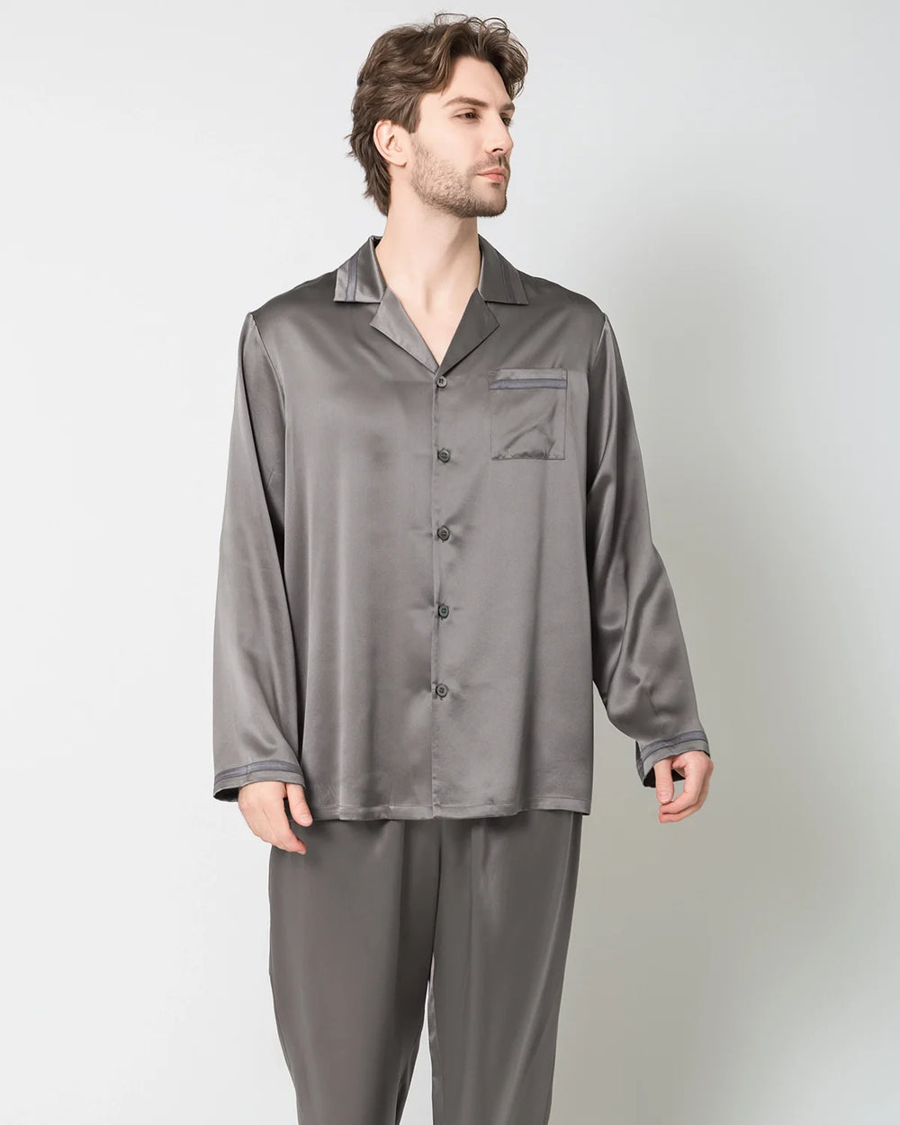 Crafted from pure silk, this ensemble promises a luxurious and soothing experience for a restful night's sleep. The long-sleeved shirt and loose-fitting long pants feature a clean and timeless solid color, adding an air of understated elegance to your nighttime wardrobe. Immerse yourself in the unmatched softness and breathability of silk, ensuring a relaxed fit that moves with you as you unwind. Elevate your evenings with the simplicity and comfort of our pure silk pajama set, where easy sophistication meets the serenity of a peaceful night's rest.