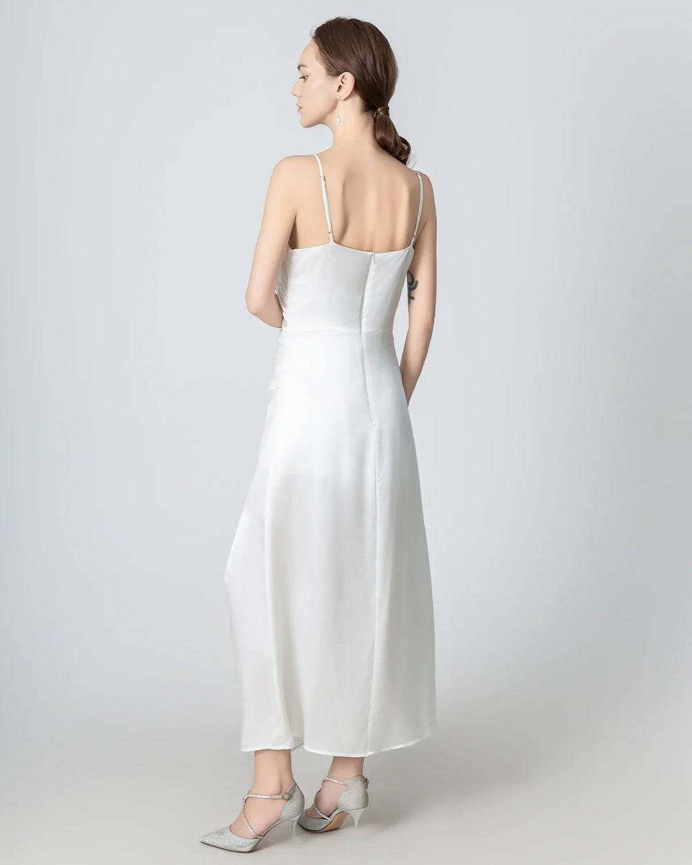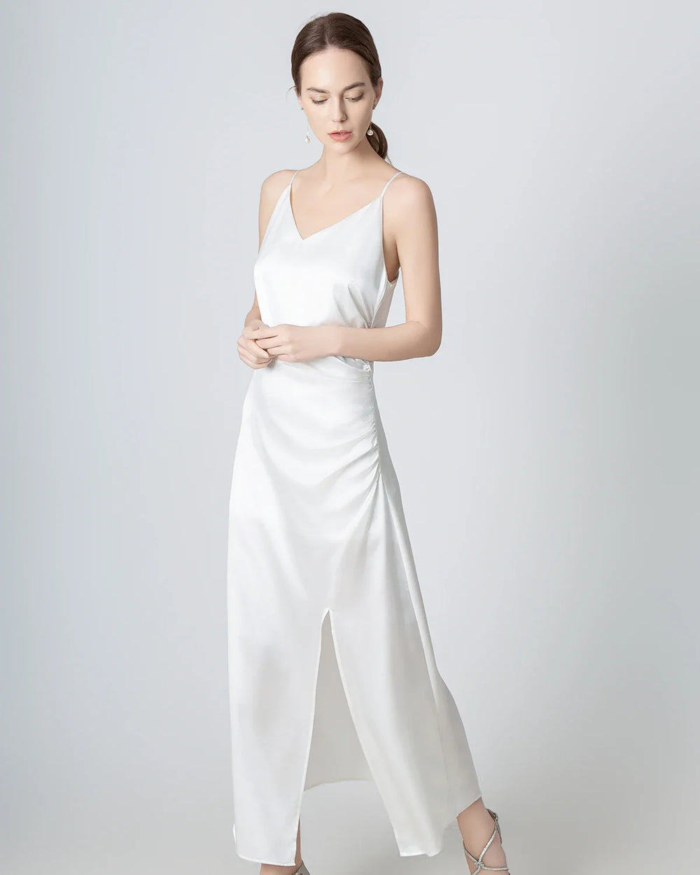 Type: Pleated Slit Maxi Silk Dress.