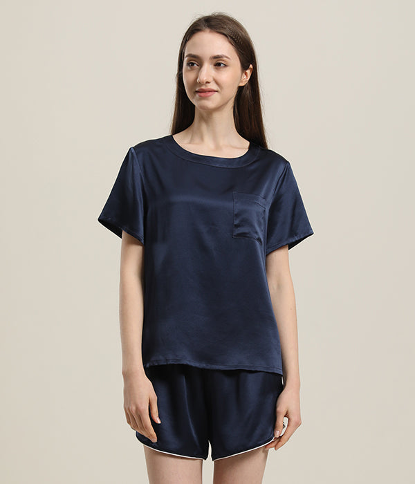 Slip into this luxurious and lightweight silk short pajama set for a comfortable and relaxing night's sleep. The smooth design features a traditional crewneck neckline and convenient pockets, while the elastic waistband ensures the perfect fit./p>